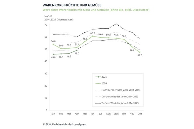 Prices for the majority of fruit and vegetable products declined in Switzerland starting in November 2024. This is according to data collected by the BLW. There were significant price declines for carrots and apples, for example. As these form a significant proportion of purchases, this has a major impact on the value of the shopping basket. Kiwis are among the few products whose prices from February to April 2025 were significantly above the average for 2014–2023. The price of individually sold kiwis rose to over CHF 1 (1,23 USD) per piece. However, packaged kiwis containing smaller fruits at significantly lower prices per piece were also available. For comparison purposes, the shopping basket contains four individual fruits and therefore records higher kiwi costs.