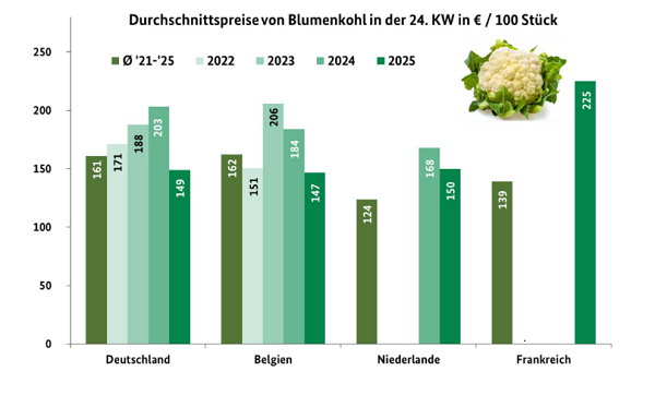 Domestic offers clearly dominated the market. They were available in both six- and eight-piece packs. In some places, the loads were available without competition. They were mostly flanked by Belgian loads. A few Dutch and French products also participated in marketing. The quality was generally good. Demand was not particularly strong and could be met without difficulty. Traders rarely had any reason to modify their previous demands. As a result of reduced storage capacity, sellers in some places granted discounts to avoid stockpiling. However, stable prices were also recorded. In Munich, supplies from Austria and France included loose florets, which did not exactly boost sales.