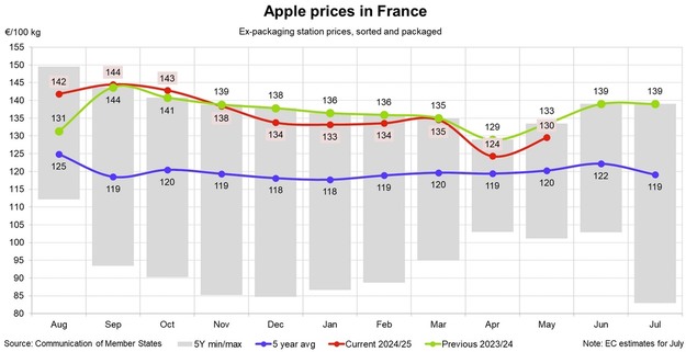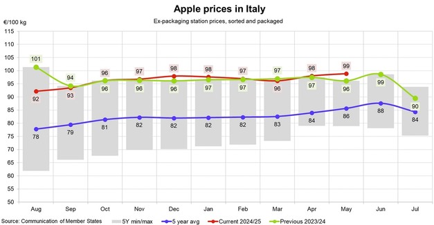 Italy displayed a more modest but consistent upward movement in apple prices over the same period. Prices rose from €96/100 kg in March to €98 in April and €99 in May. The Italian market remains relatively stable with less volatility compared to other countries, indicating a balanced relationship between supply and demand, supported by high-quality produce and steady export flows.