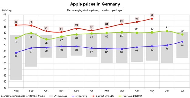 Germany recorded the most consistent and strongest gains through the spring months. Apple prices rose from €87/100 kg in March to €89 in April and reached €92 in May. This upward trend reflects firm demand and possibly reduced domestic production or storage stocks. With prices now approaching €100/100 kg, Germany is closing the gap with Italy and France in terms of market value.