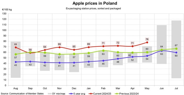 In the 2024/2025 marketing year, apple prices across major European markets have shown notable divergence, with Poland, Italy, France, and Germany following different trajectories from March through May. In Poland, apple prices rose steadily, climbing from €72/100 kg in March to €78/100 kg in May. This marks a clear strengthening trend, likely reflecting tighter supplies or increased demand for locally packaged apples.