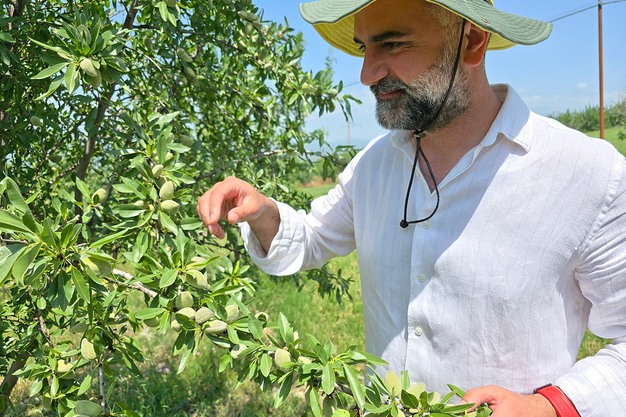 Tornike Mchedlishvili, looking at how the almonds grow on the trees in early June