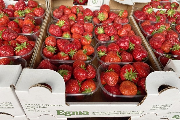 "Our suppliers pack the strawberries in the fields by placing them in 250-gram punnets. Then the punnets are put into 30x40 cartons (8 punnets per carton), for a net weight of 2 kg per package. Prices these days are good and range between €12 and 13 per package," explains Markus Tscholl, coordinator of Asta Frutta Alto Adige.