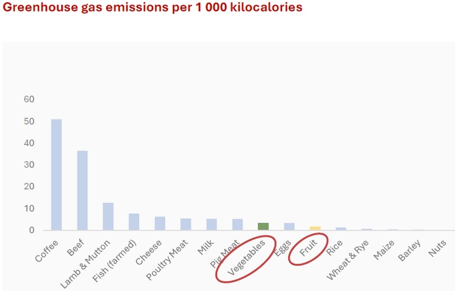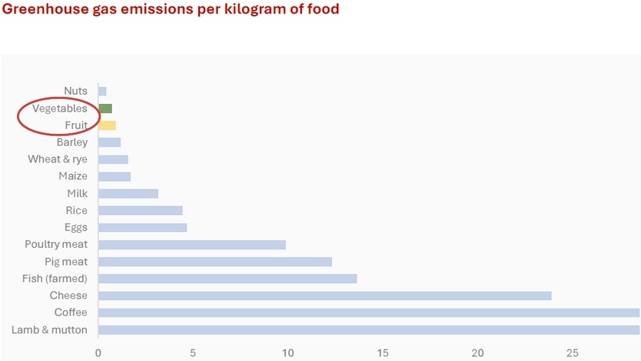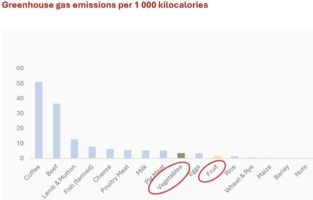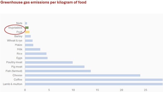 Fruits and vegetables play a central role in the push toward sustainable food systems. Not only are they essential for health and nutrition, but their environmental footprint is significantly lower than most other food categories. Compared to meat and dairy, which generate much higher levels of greenhouse gas emissions and require extensive land and water, fruits and vegetables are far more resource-efficient. For example, producing one kilogram of bananas emits just 0.9 kg of CO₂ equivalents, compared to nearly 100 kg for beef. Similarly, water usage for apples is about 180 liters per kilogram, far below the 1,796 liters needed for pork.