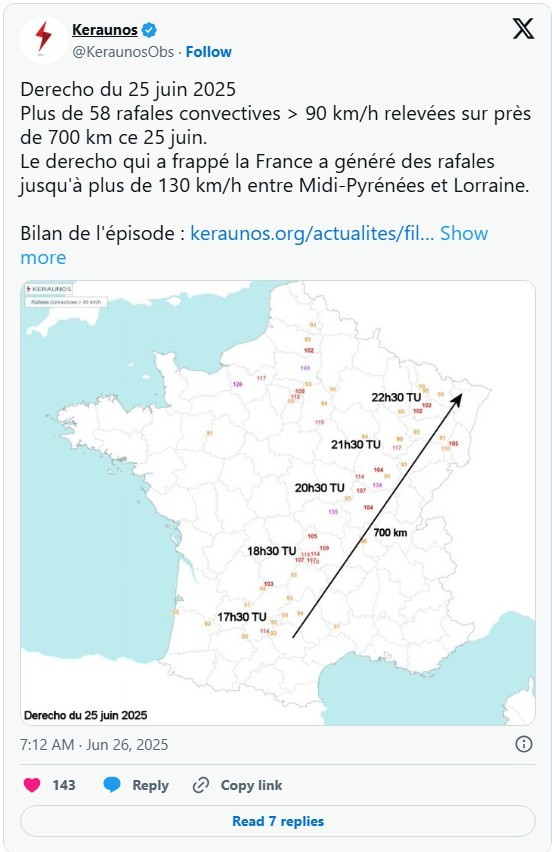 Derecho: Gusts in excess of 90 km/h, over an area of more than 400 km