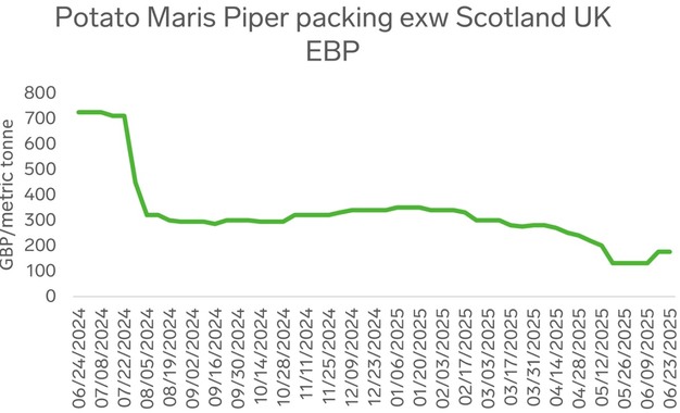 As the UK and EU potato markets face sharp price declines, the Maris Piper potatoes in the UK displayed an unusual trend. The Exw Scotland EBP for Maris Piper saw a rise to £175/mt on June 17, contrasting other potato EBPs with a 35% week-on-week increase. Prices stabilized at £130/mt beforehand, following a sharp drop mid-April.