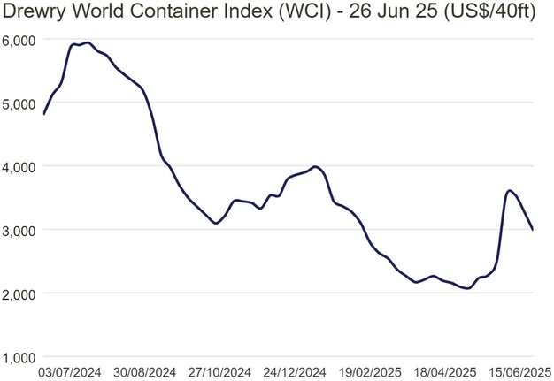 For the second consecutive week, Drewry's World Container Index fell 9% this week, following five weeks of gains. This decline is a direct result of low demand for US-bound cargo and is a sign that the recent surge in imports to the US, which occurred after the temporary halt of higher US tariffs, will fail to have the lasting impact we had initially expected.