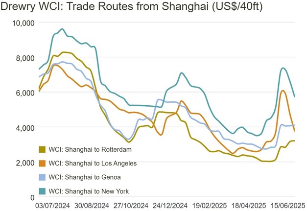 Freight rates from Shanghai to Rotterdam and Shanghai to Genoa increased 1% to $3,204 and $4,100 per 40ft container, respectively.