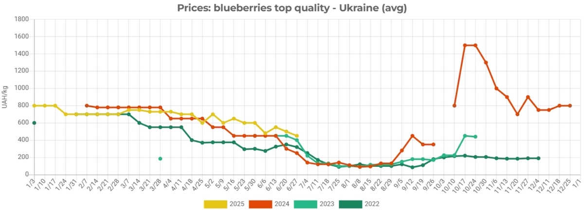 Despite the gradual decline in prices within this segment, blueberry prices on the domestic Ukrainian market remain, on average, 2.6 times higher than at the beginning of the 2024 season. Growers attribute this price difference to a reduction in total harvest volumes caused by unfavorable weather conditions during the berry's ripening period.