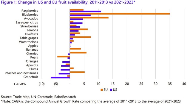 Global fresh fruit markets are undergoing structural change, according to Rabobank's latest World Fruit Map published in July 2025. While many trends from the 2018 edition continue, such as strong demand for blueberries and avocados and the dominance of the U.S. and Europe in fruit imports, the report outlines new shifts driven by climate conditions, cost pressures, and evolving consumer preferences.