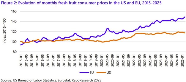 Consumer prices for fresh fruit have sharply increased since 2020. As of January 2025, prices in the EU were 30 percent higher than five years earlier, while U.S. prices rose by 19 percent. While prices stabilized in the U.S. after a spike in 2022, certain processed fruits, particularly orange juice, saw even sharper increases. Frozen concentrated orange juice futures rose 370 percent from January 2020 to January 2025, a result of disease outbreaks and weather-related disruptions in Brazil and Florida.