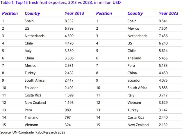 Latin America continues to solidify its role as a key exporter. Mexico rose to second place globally in export value, while Peru and Thailand advanced to seventh and sixth, respectively. The U.S. dropped from second to fourth place over the past decade. Spain remains the world's top exporter, while the Netherlands retains its role as a central EU import hub. Despite global fruit production growing at an annual rate of 1.7 percent, domestic production in the EU and the U.S. has declined, increasing import dependency, particularly for tropical fruits and out-of-season supply.