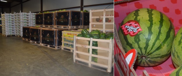 Left: A glimpse into the cold storage room full of melons. Right: Spanish Jimbee watermelons.