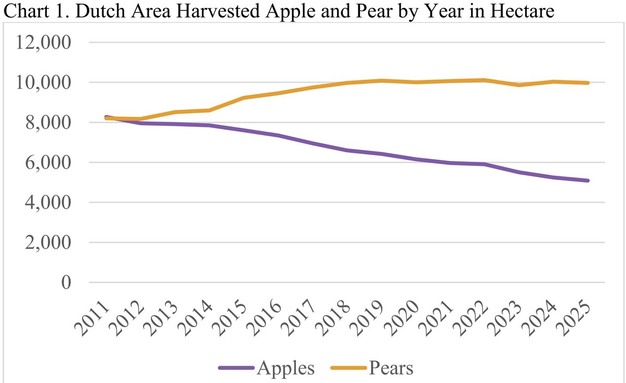 Apple acreage has continued to decline, dropping to an estimated 5,086 hectares in 2025, three percent lower than last year and about one-third of the area planted 25 years ago. This reduction is linked to declining profitability, reduced generational succession, pesticide restrictions, and high replanting costs. Despite this, yields have increased due to favorable weather.