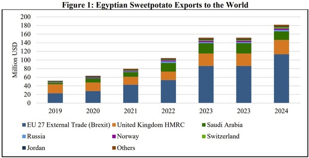 In 2024, Egypt exported sweetpotatoes valued at US$181.8 million worldwide, with the EU as a leading destination. Expansion has been supported by the Agriculture Export Council (AEC) through improved production techniques, packaging to meet international standards, and infrastructure investment.