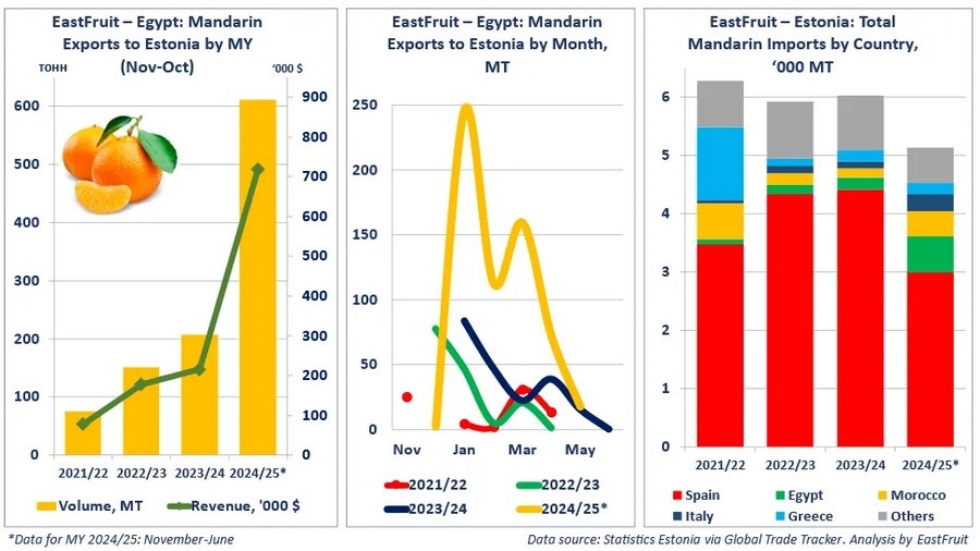 Between November 2024 and June 2025, Egypt exported 610 tons of mandarins to Estonia, valued at US$717,000, according to EastFruit. This volume is three times higher than the total exports in the previous marketing year and eight times greater than in MY 2021/22. The average annual growth rate over the past three marketing years reached 100%.