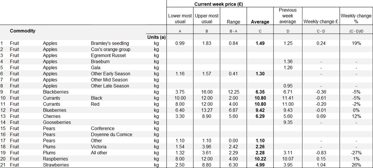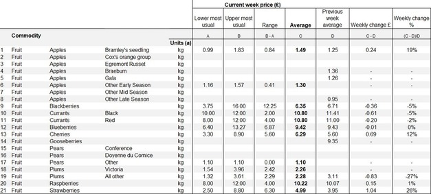 Cherries also moved upward in price. The previous week's average of £5.60 per kilo increased to £6.29 per kilo. This equates to a rise of £0.69 or 12%. In contrast, plums under the "all other" category showed a decline. Their average dropped from £3.11 per kilo in the previous week to £2.28 per kilo, representing a fall of £0.83 or 27%.