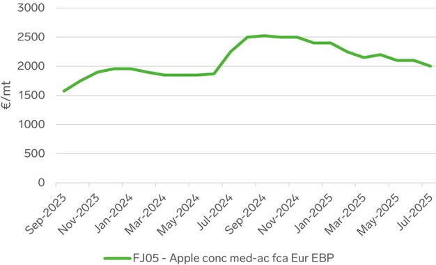 Harvesting of early apple varieties has already begun in some regions, while Turkey's season is set to start in September. Market observers will monitor whether tightening supply conditions trigger an upward trend in apple juice prices in the coming months.