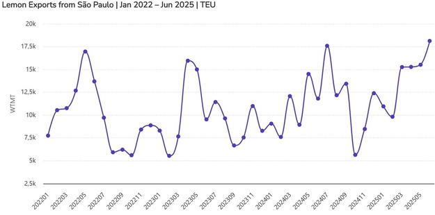 The state of São Paulo is Brazil's largest lemon producer and continues to expand exports. According to the Institute of Agricultural Economics (IEA – Apta), part of the São Paulo Secretariat of Agriculture and Supply (SAA), more than 1.1 million tonnes were harvested in 2024. In the first half of 2025, exports reached 81,000 tonnes worth US$72 million, up 21% from the same period last year.