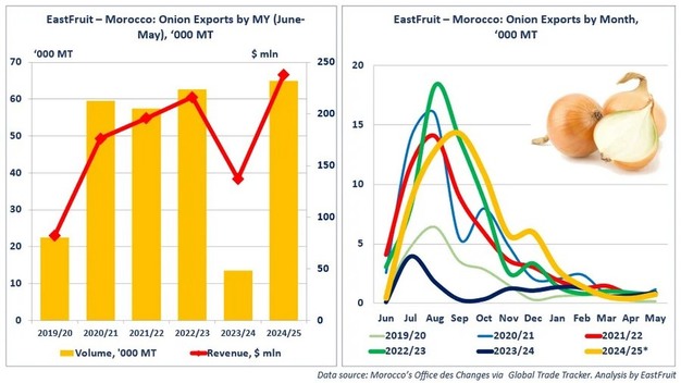 Morocco's fresh onion exports reached record levels in the 2024/25 season following the lifting of restrictions. According to EastFruit, between June 2024 and May 2025, Morocco exported 64,900 metric tons of fresh onions valued at US$238 million. This represented a 4.8-fold increase compared to the previous season and 3% above the earlier record set in 2022/23.