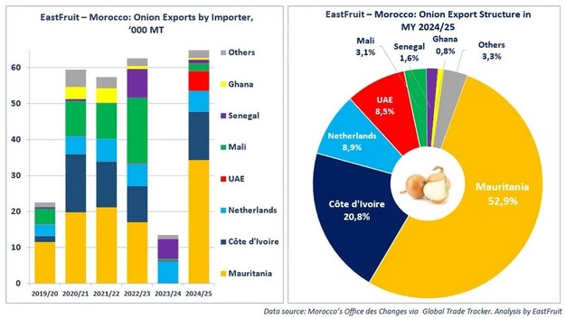 West Africa remained the main destination. Mauritania doubled its intake compared with 2022/23, while exports to Côte d'Ivoire also increased. Shipments to Mali and Senegal declined. Morocco also gained new access to the Middle East, with the United Arab Emirates importing 5,500 tons, or 8.5% of total onion exports.