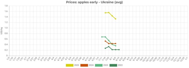 The market is mainly supplied with autumn apple varieties that are not suitable for long-term storage. Growers are therefore seeking to sell fruit quickly, leading to price reductions. Despite the decline, apples on the Ukrainian market are currently offered at twice the price compared to the same period last year. Industry experts link this trend to a decrease in the country's total apple harvest.