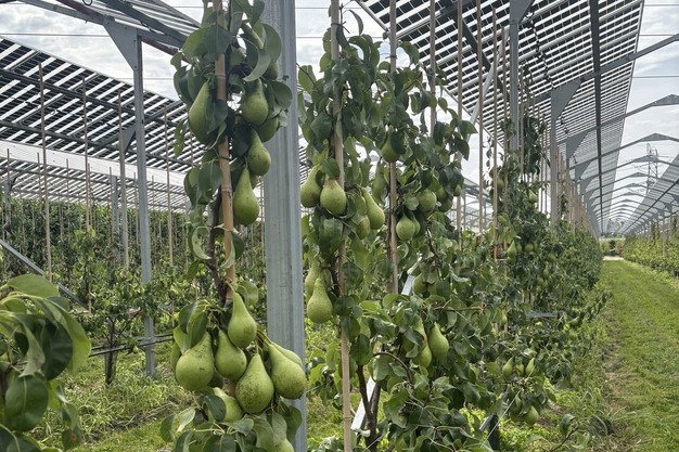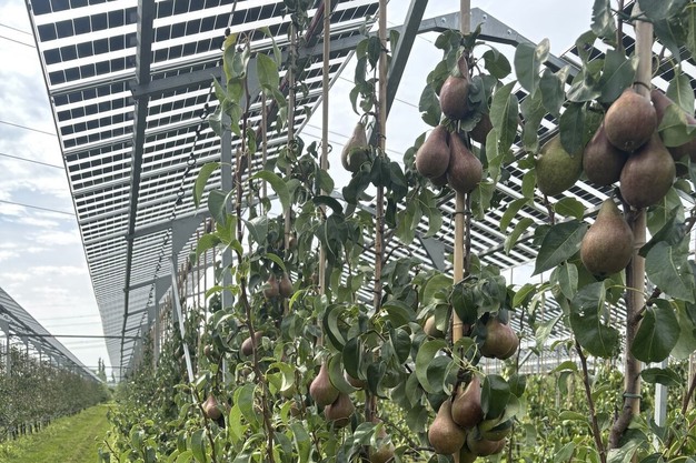 At Jan van Os' fruit farm in Papendrecht, the pears are developing well. This year's yield is higher than expected, and Van Os attributes this to the solar panels that protect the pears from bright sunlight and hail. The panels are supported by steel structures supplied by Trellex-RE in Blokzijl.