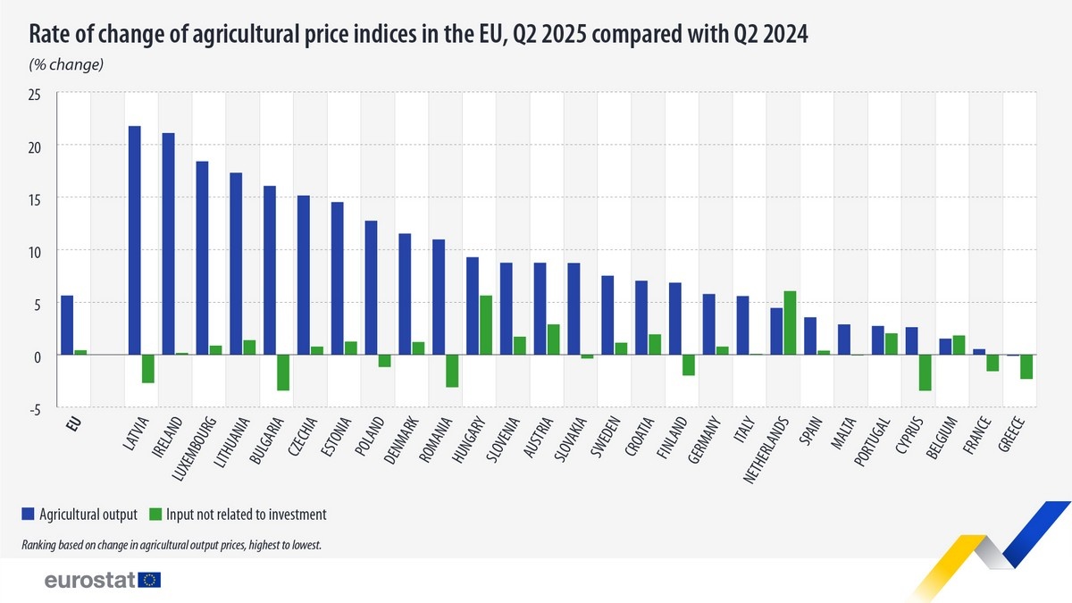 Agricultural output prices rose in nearly all EU countries in the second quarter of 2025 compared with the same quarter of 2024, except for Greece. The largest increases were recorded in Latvia (+21.8%), Ireland (+21.1%), and Luxembourg (+18.4%). Greece showed a slight decline of 0.1% during this period.