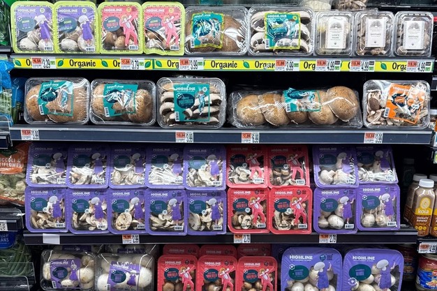 Rebranded mushroom products on the shelf.