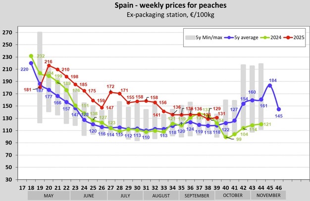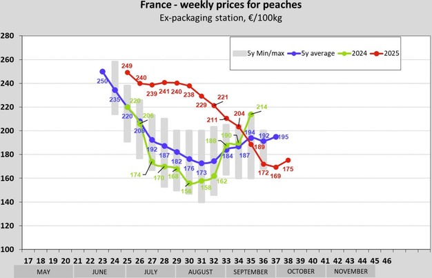 Peach prices across Europe show varied trends in weeks 37 to 39 of the 2025 season. In Spain, prices recorded at week 37 were €136/100 kg, falling further to €129 in week 38, before rebounding slightly to €131 in week 39. This placed them below the five-year average, continuing a season of pressure on returns compared to last year.