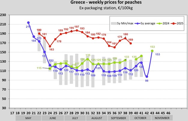 In Greece, prices stood at €175/100 kg in week 37, rising to €180 in week 38 before slipping back to €169 in week 39. Despite the decline, values remain well above both the five-year range and 2024 levels, reflecting strong demand during this period.