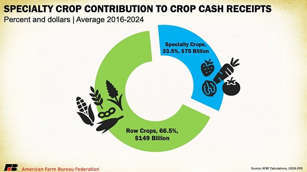 Specialty crops include more than 350 commodities and account for one-fifth of U.S. agricultural cash receipts across 220,000 farms. The diversity of crops increases exposure to weather, pests, regulatory requirements, and perishable supply chains. Many crops lack price transparency, making hedging difficult. Imports of fruits, vegetables, and nuts add further pressure, while limited access to insurance or futures markets leaves growers exposed.