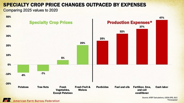 Between 2020 and 2025, producer price indices show potato prices declined by 8% and tree nuts by 7%. Fresh vegetables rose only 5% and fruit and melons by 20%. Over the same period, pesticide costs increased by 25%, fuel by 31%, fertilizer by 37% and labor by nearly 50%. USDA data show specialty crop farms averaged more than US$466,000 in cash expenses in 2023, up 47% from 2021.