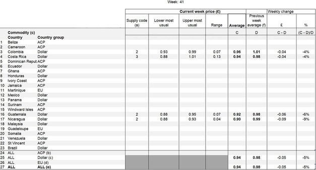 Colombian bananas averaged £0.96 per kilogram, down from £1.01 the previous week, marking a decrease of £0.04 per kilogram or approximately 4%. Similarly, Costa Rican bananas recorded an average price of £0.94 per kilogram, compared with £0.98 previously, showing a drop of £0.04 per kilogram.
