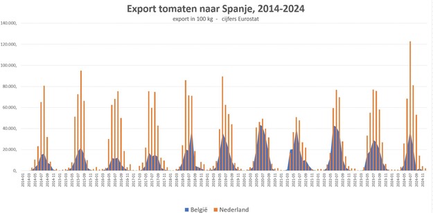 © Eurostat/Thijmen TiersmaTomato exports from Belgium and the Netherlands to Spain, 2014-2024. Click here to enlarge.