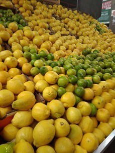 Right: a sprinkling of limes on a mountain of lemons in a branch of retailer Food Lover's Market