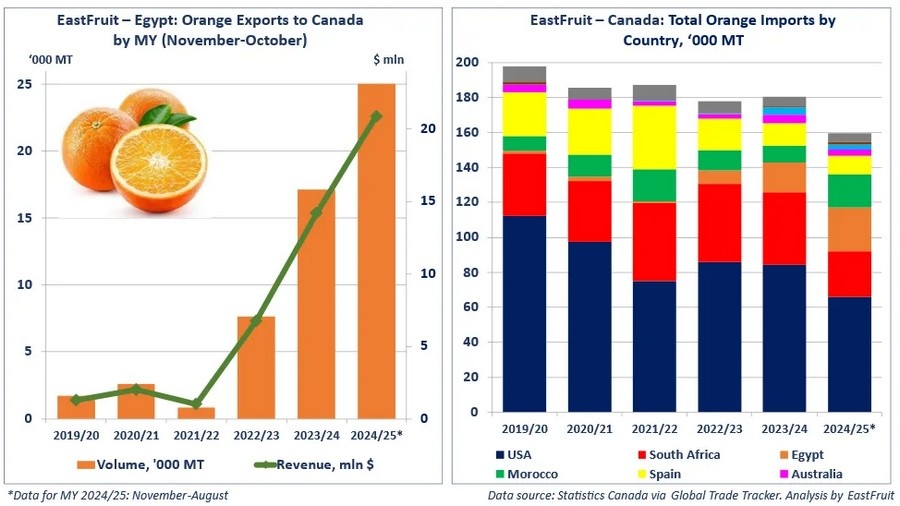 Egypt continues to expand its role in the Canadian orange market, reaching a new seasonal export record, according to EastFruit.