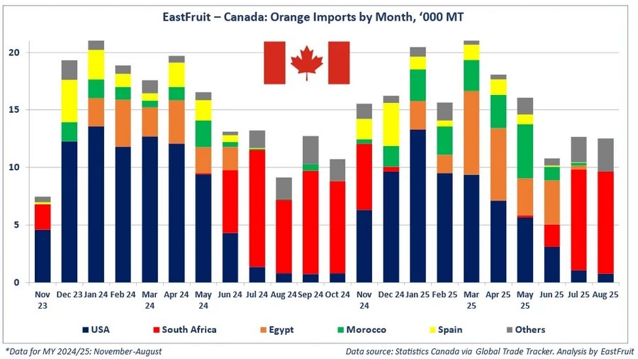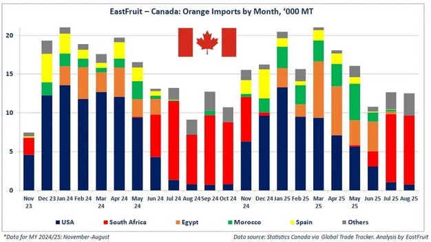 The Canadian orange market is mainly supplied by the United States and South Africa, which together account for 60–70% of total imports. U.S. oranges dominate the market from December to May, while South African fruit leads from July to October.