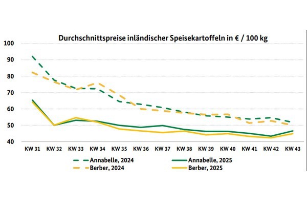 The fundamental market situation for potatoes remains unchanged. The harvest is now likely to be complete nationwide, but there is still pressure on supply from temporary storage facilities in surplus areas. Packages weighing 5 kg or more are increasingly found in food retail outlets, but neither promotions nor exports are providing any noticeable impetus. Warehouses are filled to above-average levels, but surcharges for high-quality stored goods are not foreseeable for the moment.