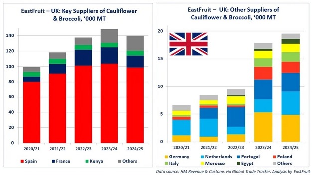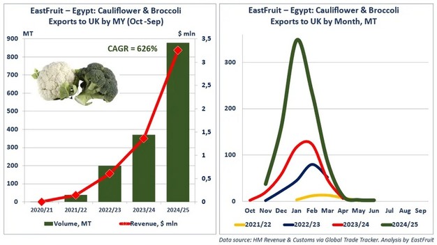 Egyptian shippers of cauliflower and broccoli continued to expand their presence in the UK market for the fourth consecutive season, according to EastFruit. In the 2024/25 marketing year, from October to September, export volume reached a record 879 tons. Export value exceeded US$3 million for the first time. The shipped volume was 2.3 times higher than the previous season and surpassed the combined volume of the previous four seasons. The average annual growth rate during this period was reported at nearly 626 per cent.
