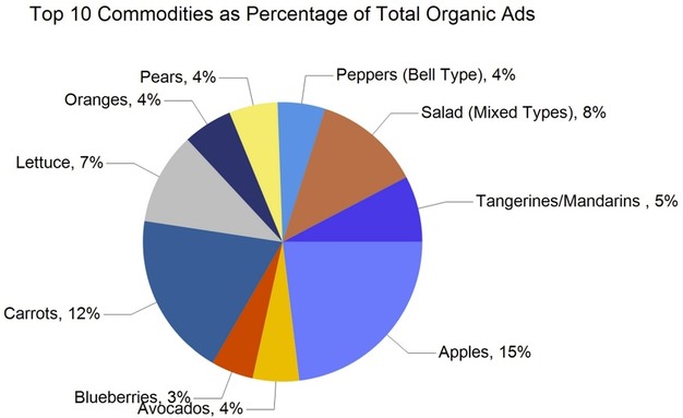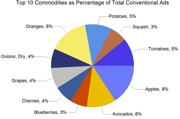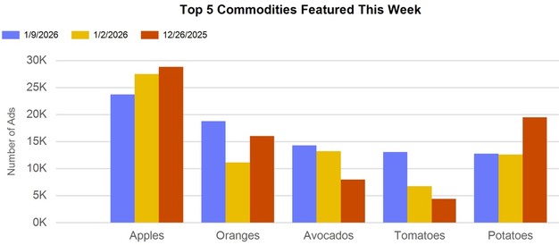 Total advertised items reached 268,213 this week, representing a 5% increase from the previous week's total of 254,802. Compared with the same week last year, total ad volume was 4% lower, down from 278,144. By commodity group, fruit accounted for 146,540 ads, or 55% of the total. Vegetables represented 93,822 ads, or 35%, while onions and potatoes totaled 21,879 ads, or 8%. Smaller categories included herbs with 637 ads, ornamentals with 2,359, hemp with 1,444, and honey with 2,169. Organic produce accounted for 41,140 ads, representing 15% of all advertised items.