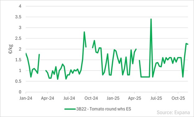 In Spain, adverse weather conditions, including heatwaves in summer 2025, contributed to lower processing volumes. The WPTC estimates a 22% y-o-y decline in Spanish processing production for 2025. In the Spanish market, prices for round tomatoes stood at €2.23/kg on 19 November (latest available data), up 39.4% quarter-on-quarter and 8.8% y-o-y. Converted to US dollars, €2.23/kg is approximately US$2.40/kg at current exchange rates.