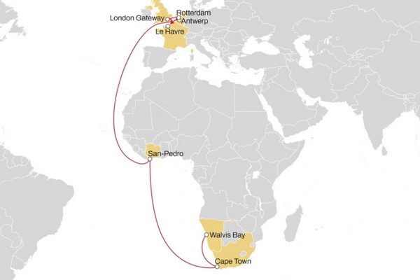 The updated port rotation for the service is Walvis Bay, Cape Town, San Pedro, London Gateway, Rotterdam, Antwerp, and Le Havre.