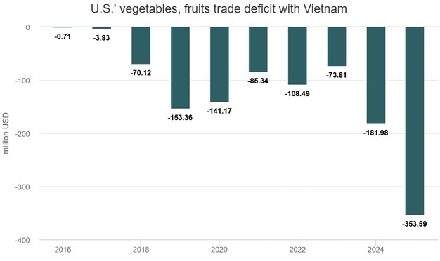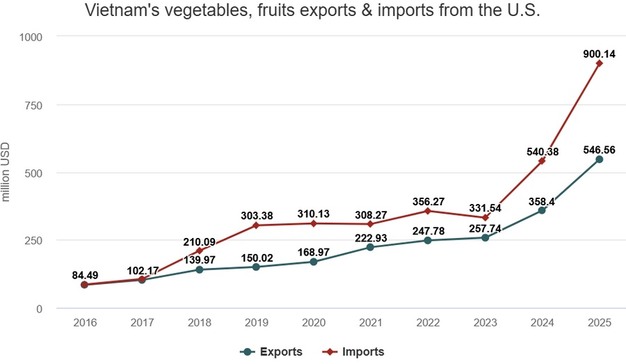 U.S. fruit and vegetable shipments to Vietnam rose sharply in 2025, while Vietnam's exports to the U.S. market continued to lag behind. According to Vietnam Customs data, Vietnam imported nearly US$900 million worth of fruits and vegetables from the U.S. in 2025, an increase of almost 67 per cent compared to the previous year. This represents a tenfold increase compared with imports from the U.S. a decade earlier. Key imported products included cherries, apples, grapes, and oranges.
