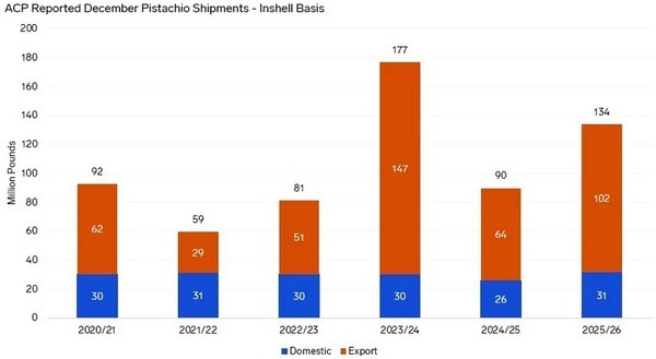 The Administrative Committee for Pistachios released its shipment update on Jan. 15, 2026, covering the fourth month of the 2025/26 U.S. pistachio crop year. The season follows an on-year cycle, which typically results in higher volumes. All figures are reported on an in-shell equivalent basis, with kernel volumes converted using a 0.45 ratio to ensure consistency.