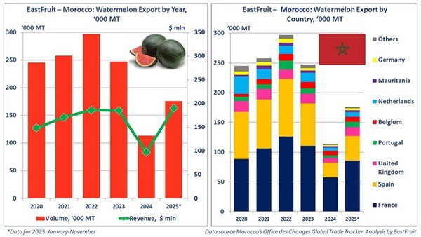 Morocco has started to restore its watermelon export flows following a sharp contraction in 2024, according to EastFruit. In the first 11 months of 2025, Morocco exported 175,000 tons of watermelons with a total value of US$190 million, representing a 54% increase compared with 2024.