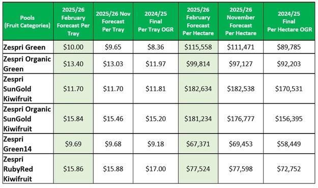 Zespri has released its final forecast for the 2025/26 season, with forecast per-hectare returns at record levels for all fruit categories.