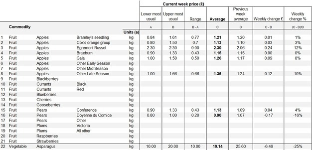 UK wholesale fruit prices showed mixed but generally stable movement this week, with modest increases across several apple varieties and pears, while asparagus recorded a notable decline.