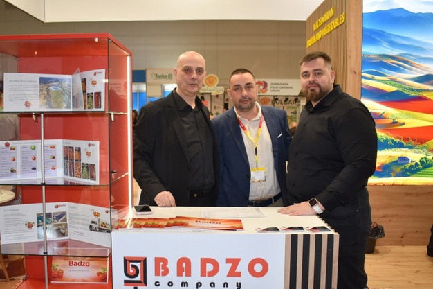 Ivan Popov (left), Vasil Shapkarov (center), and Anton Semenov (right) from Badzo at Fruit Logistica 2026.