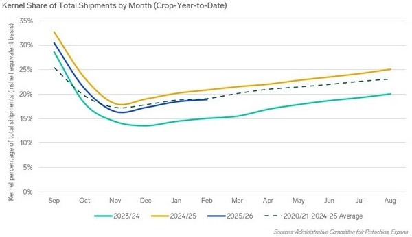 Total kernel shipments from September to February reached 63.5 million pounds gross kernel weight, or 141.2 million pounds in-shell equivalent. This is an increase of 12.6% compared with the same period last year and 20.7% above 2024. Compared with the five-year February average of 47.7 million pounds, shipments are higher by 33.1%. Kernels represented 18.9% of total crop year-to-date shipments on an in-shell-equivalent basis, compared with 20.8% in 2025 and 15.0% in 2024.